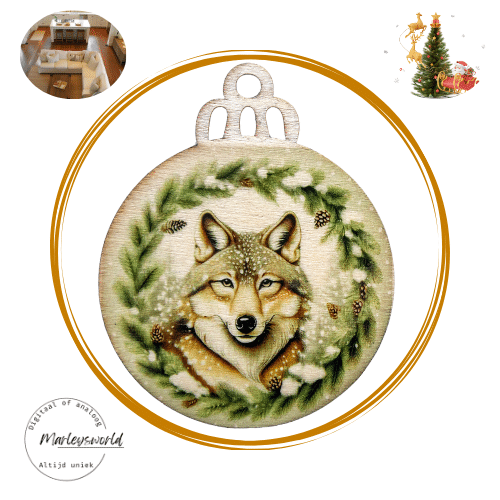 Houten kerstbal met afbeelding van wolf