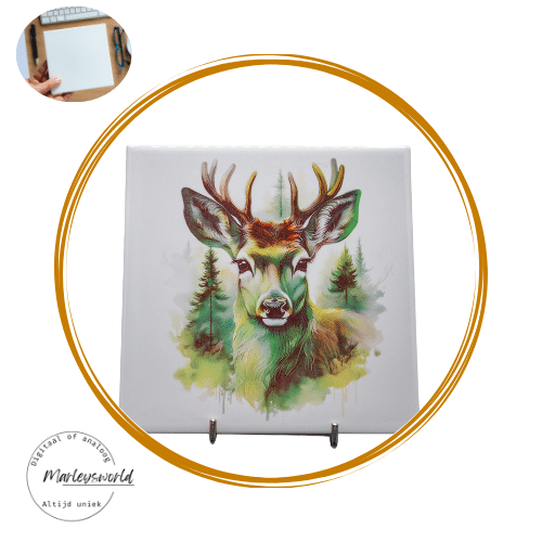Tegel met afbeelding van een reebok. Afbeelding gemaakt door “Marleyart” Handmade.
